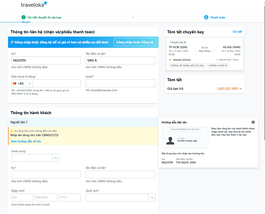Sau khi chọn được chuyến bay, bước tiếp theo là điền thông tin hành khách. Đây là công đoạn đòi hỏi sự chính xác tuyệt đối.